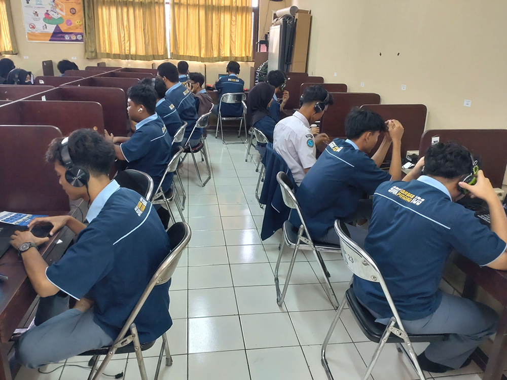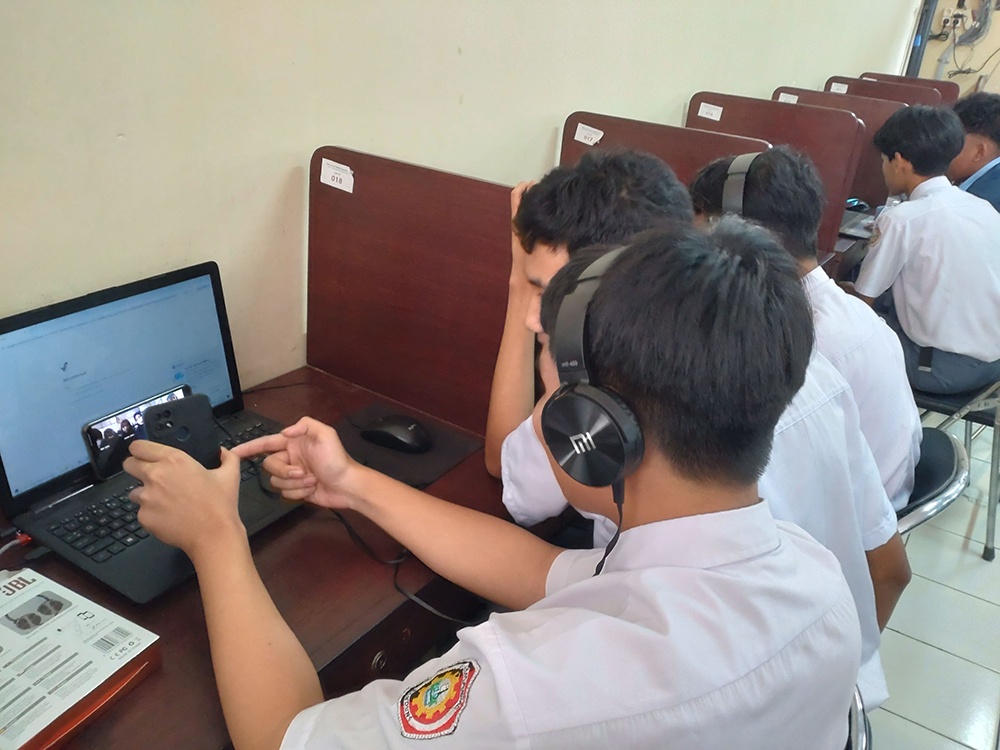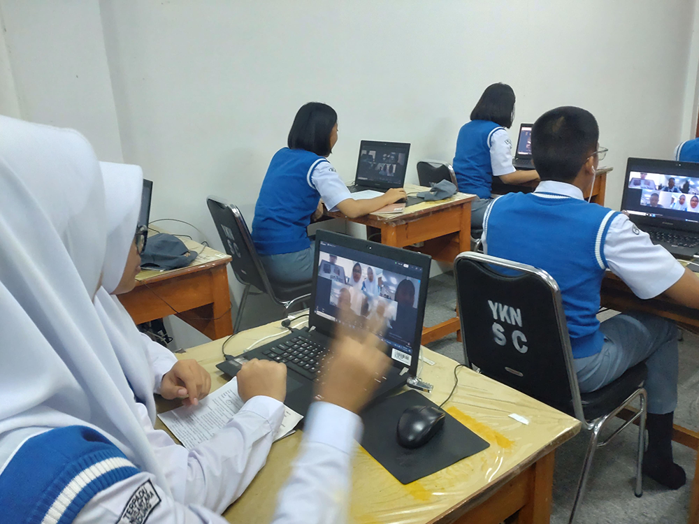 いざ始まると、最初は緊張していたものの徐々に打ち解けていき、大きな笑い声が聞こえるようになりました。イガサール・ピンダッド・バンドン専門高等学校では、途中でWi-Fiが落ちてしまい、クラスの半分のパソコンが動かなくなりましたが、生徒たちは自分のスマートフォンを使いながら、交流を続けてくれました。