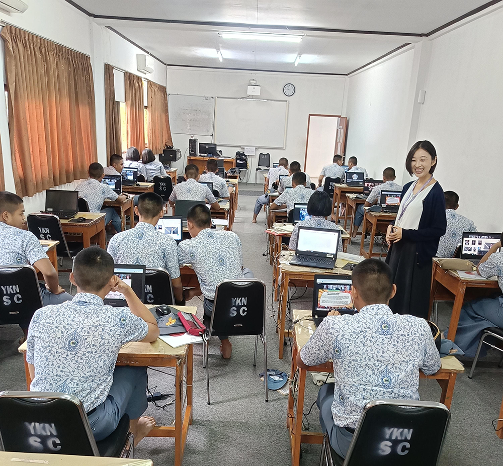 テルパドゥ・クリダ・ヌサンタラ高等学校でも、同じように交流授業を行いました。英語で話しかける生徒が多くいましたが、私が「ぜひ日本語使って話してね」と言葉かけをすると、単語だけでも日本語を使って話したり、翻訳アプリを使って言いたいことを翻訳したりする等、日本語も使いながら交流をしてくれました。