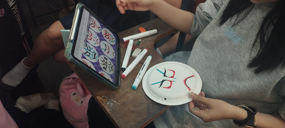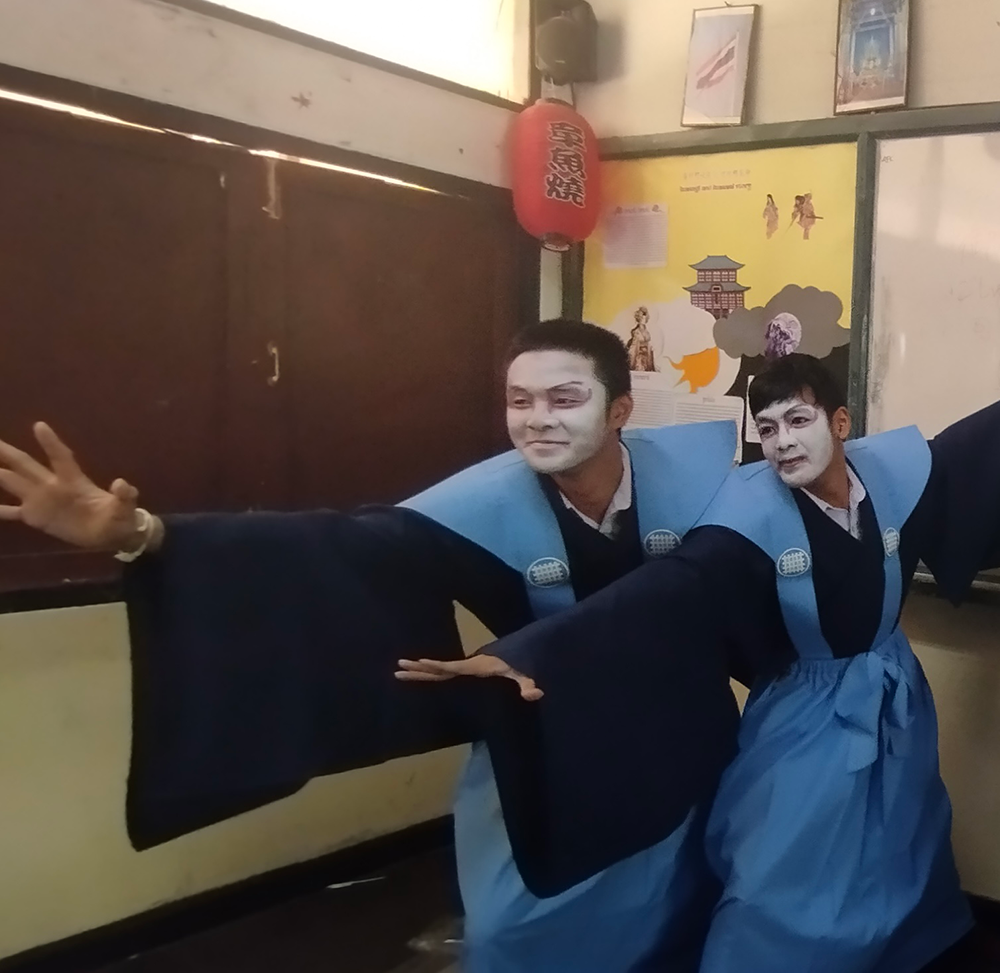 タイにも「โขน」(コーン)という仮面劇があります。昔は宮廷で男性のみが演じていたものです。インドの叙事詩「ラーマーヤナ」に影響を受けた「ラーマキエン」が主に上演されるそうです。歌舞伎と同様、格式高い様式美を持っています。文化紹介の時間は現地の日本語の先生や生徒からタイの文化を教えてもらえる貴重な時間でした。