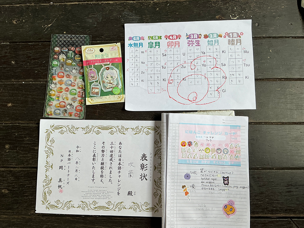 ルールはシンプルです。日本語で会話をするとスタンプがもらえ、30個集めるとご褒美と賞状があります。賞状には、生徒の名前を当て字の漢字で書いています。漢字の意味を説明すると、生徒たちはとても嬉しそうな表情を見せてくれます。