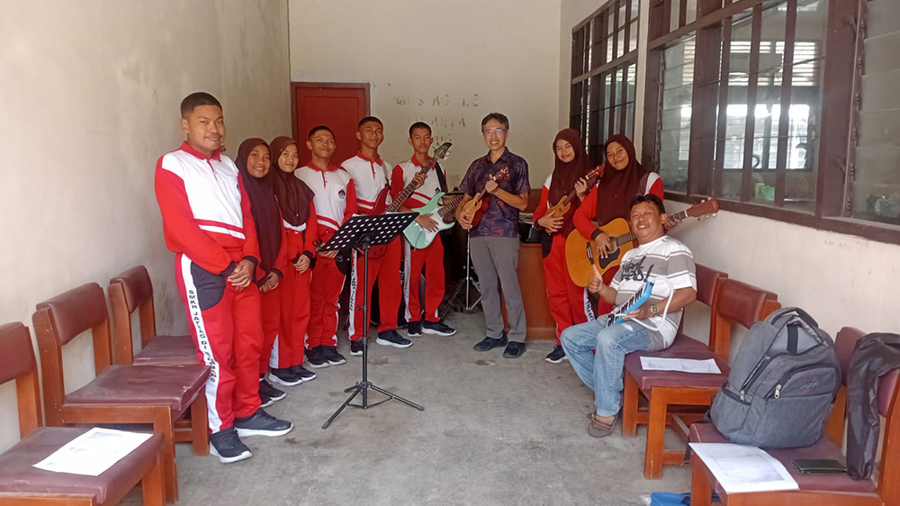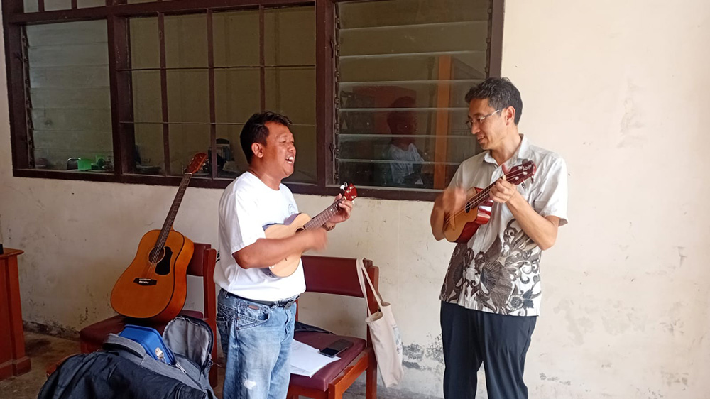 そんな中で、日本の歌を紹介し、インドネシアの歌も知るのが、一つの目標でした。趣味で合唱をしていますが、1人で歌うのは勇気がいりますね。でも、歌ったり「歌が好きです」と言っていたら「音楽クラブに参加してみませんか」と誘われました。行くと、音楽の先生から「楽器はできる?」「子供の頃ピアノを少し」「じゃあ、やってみよう」「えっ」