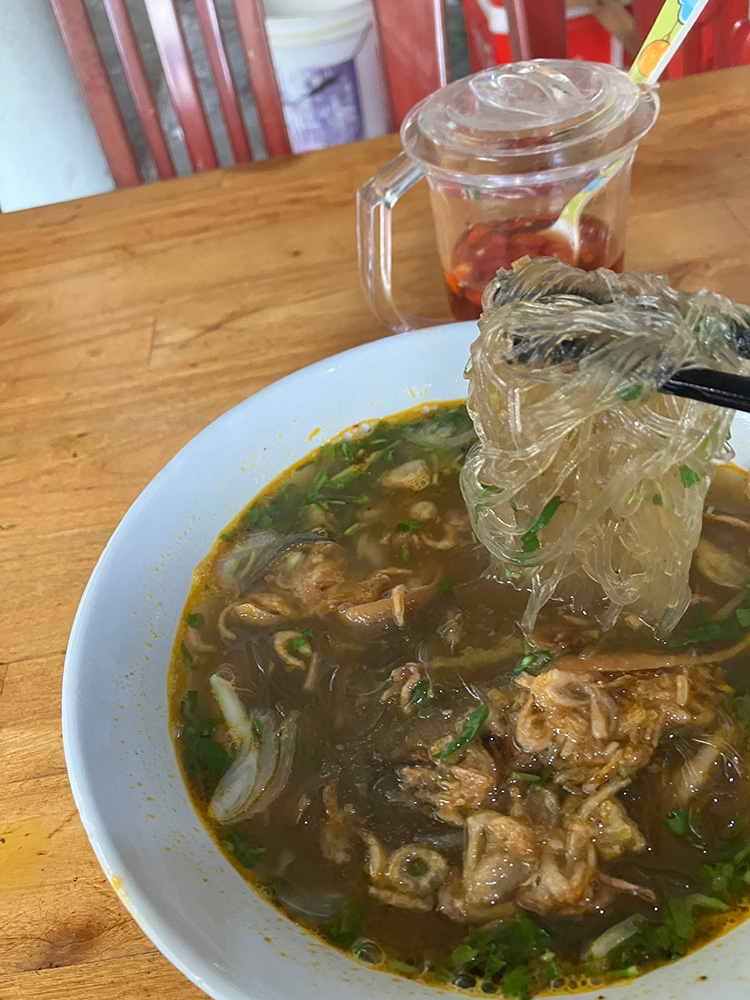 もう一つ、ゲアンで有名なものは、うなぎのスープです。日本のかば焼きのイメージとは全く違う田鰻の少し辛めのスープで、フランスパンをちぎって浸したり、麺を入れたり、お粥にかけたり、いろいろな食べ方が楽しめます。主に朝食に食べます。