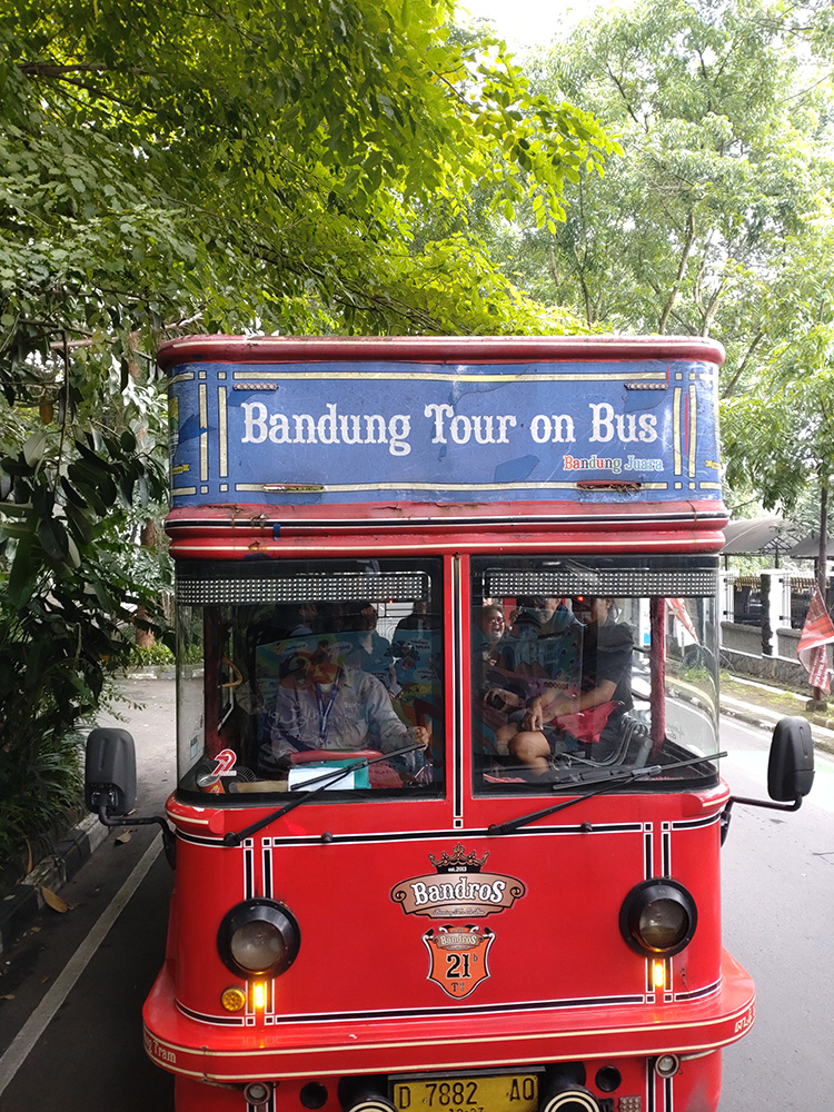 まずはバンドロスです。予約なしでブラガ通りやグドゥン・サテ等バンドン名所をバスの中から観光できます。乗務員がインドネシア語で建物の解説をしてくれるので、ぜひ乗ってみてください。